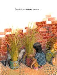 goyangiGoyangi Means Cat is about a young Korean girl, Soo Min, who is adopted by an American family and brought to the United States.  Soo Min knows no English.  Her new family knows only a few words of Korean.  Slowly, she teaches her new parents a few Korean words, including “no”, “hurt” and most importantly the world for “cat”, goyangi.  Soo Min is struggling to adjust to her new life with her new family in America.  She finds comfort petting their cat.  When Goyangi escapes the apartment one day, Soo Min and her new mom look for the cat everywhere.  Goyangi finally returns, and Soo Min, as she hugs Goyangi, says her first English word, “home”.